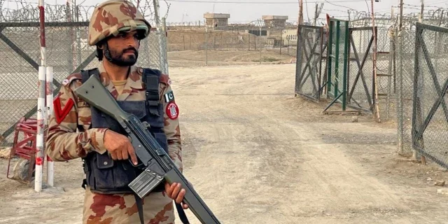 An army soldier stands guard at a deserted entry point at the Friendship Gate, following the exchanges of fire between Pakistan and Afghanistan forces, at the border crossing between the two countries, in Chaman, Pakistan February 27, 2026. Picture taken with a mobile phone. REUTERS/Abdul Khaliq Achakzai