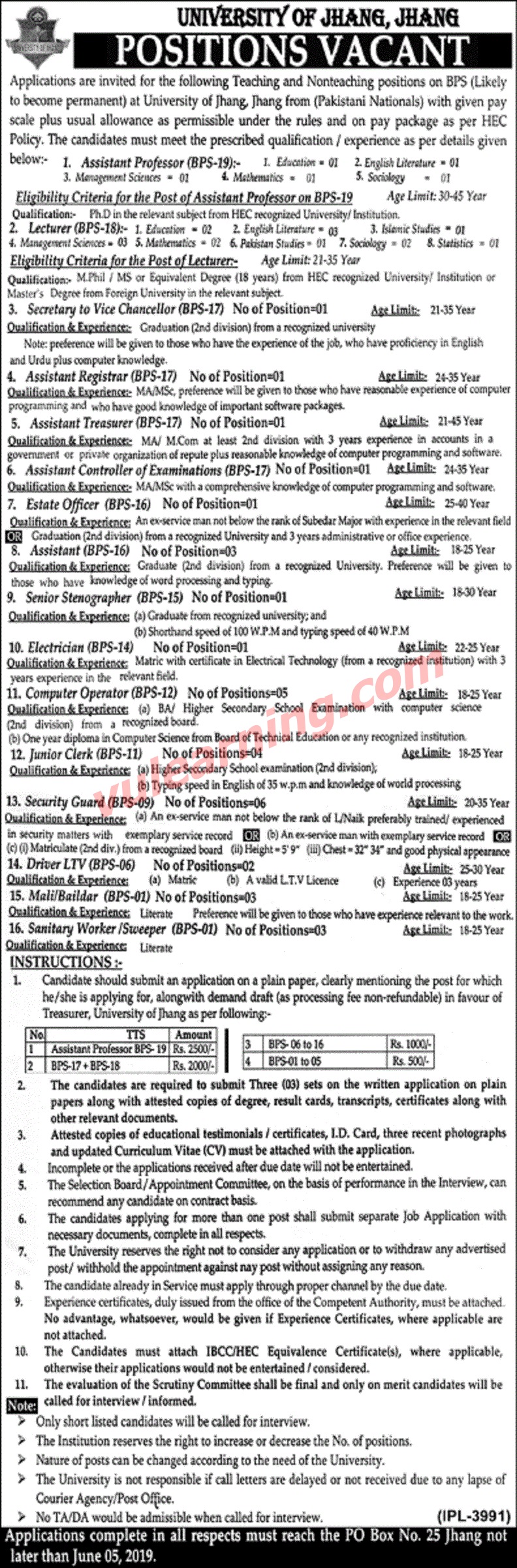 Assistant Professor, Lecturer with complete details are available here for desirous individuals. The University of Jhang is offering the jobs which belong to Education. The working hours are as per routine i.e. 8 hours a day and 40 hours a week. The job location is PUNJAB Jhang. The persons meeting the requirement of vacant post(s) may enjoy salary of 0. The most important thing is that the applications must be complete and should receive upto June 5, 2019. The advertisement of University of Jhang contains complete information about job specifications, job description etc. which is published in Daily Nawaiwaqt and Daily Jang dated May 2nd, 2019, Thursday.
